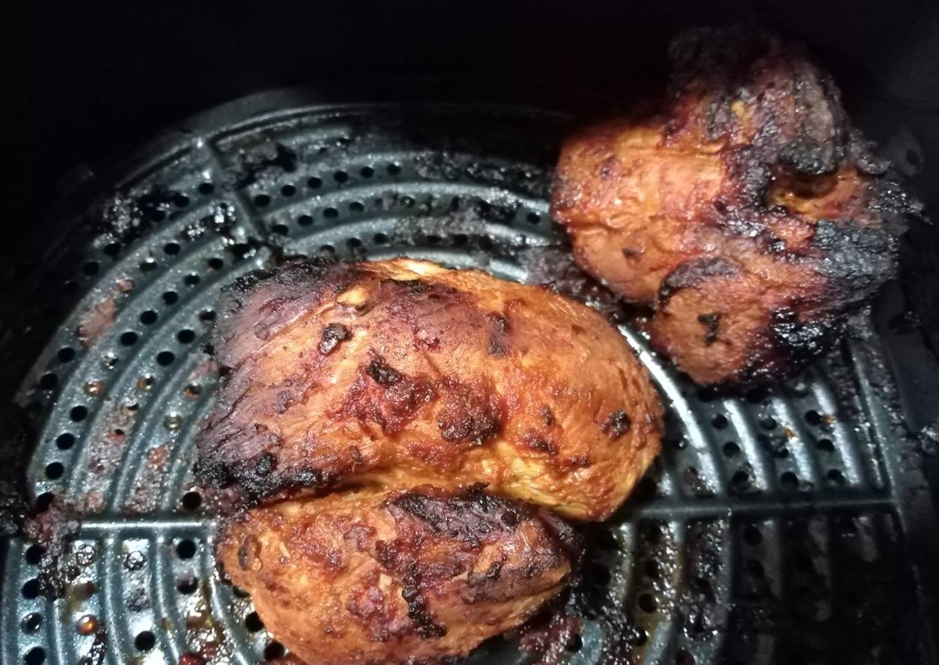 - Poner en el fondo de la freidora la cerveza, colocar en la rejilla los trozos de pierna marinados a 180° por 20 minutos. Reposar 5 minutos, voltear y poner otra vez a 180° por 25 minutos. Reposar 10 minutos y sacar. Cortar en rebanadas.