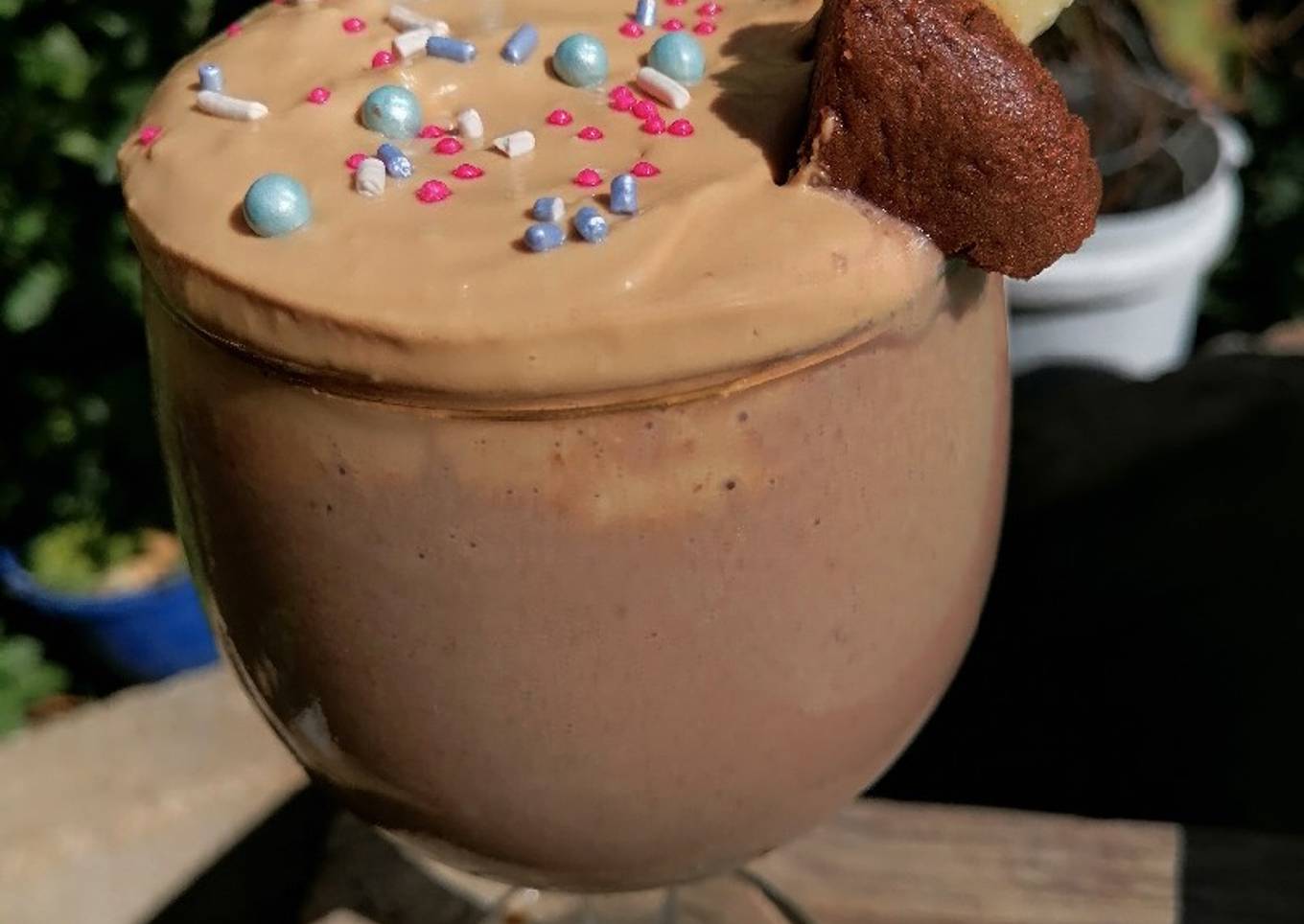 - Servimos en una copa y decoramos con crema batida y una rebanada de muffin y unas chispas de colores.