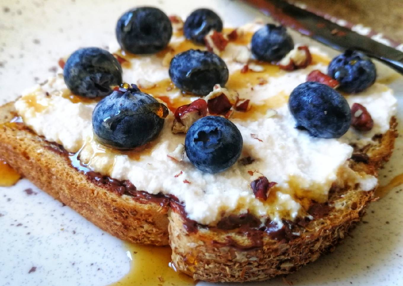 - Entonces extenderlo en el pan y agregar el ricota, las blueberries, nuez en trocitos, por último un chorrito de miel de agave. Y es todo. Listo para disfrutar.