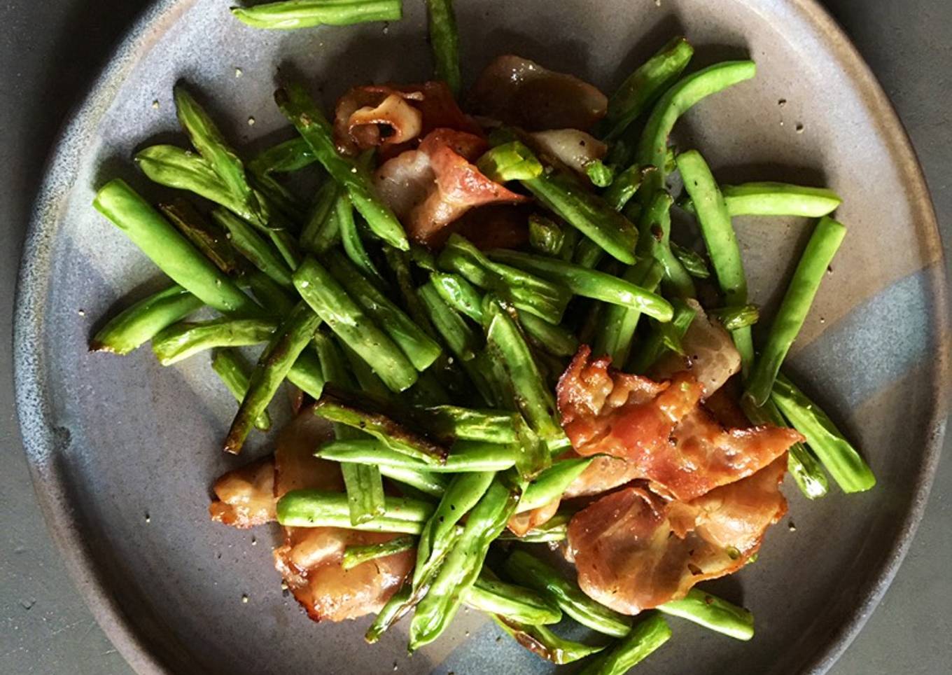 - Agregar los ejotes a la sartén, junto con sal y mezclar. Cocinar por otros 5 minutos.