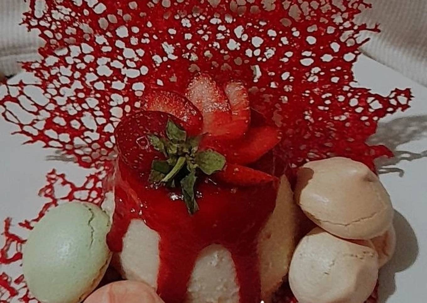 Elaborada con base de galleta de masa sucre, coulis de fresa, coral comestible y suspiros de merengue.