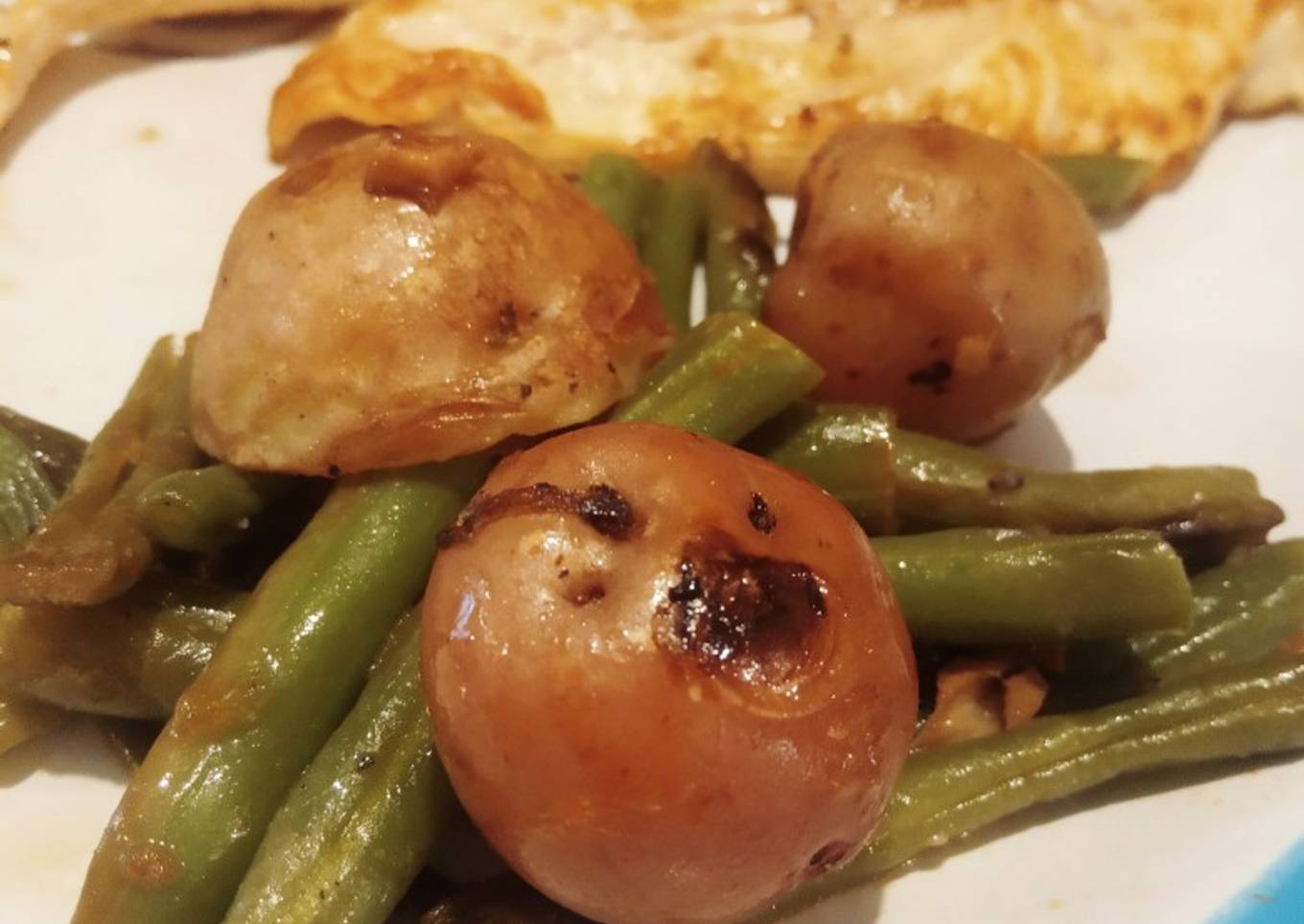 - Mientras, lavar los ejotes y las papas. Cortar las puntas de los ejotes y cortarlos por la mitad.