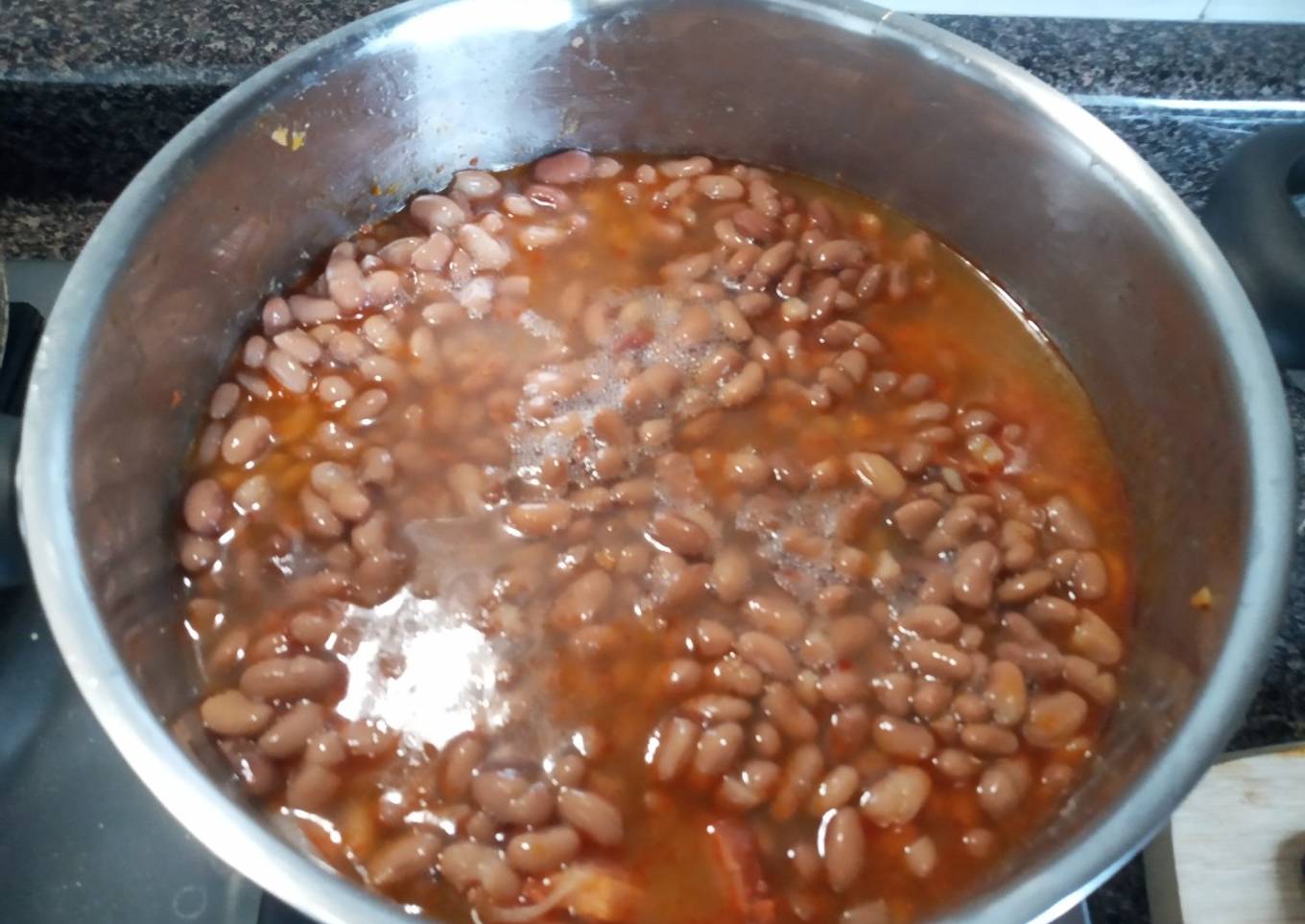 - Por último se agrega el bote de frijoles con un poco de caldo de los mismos.