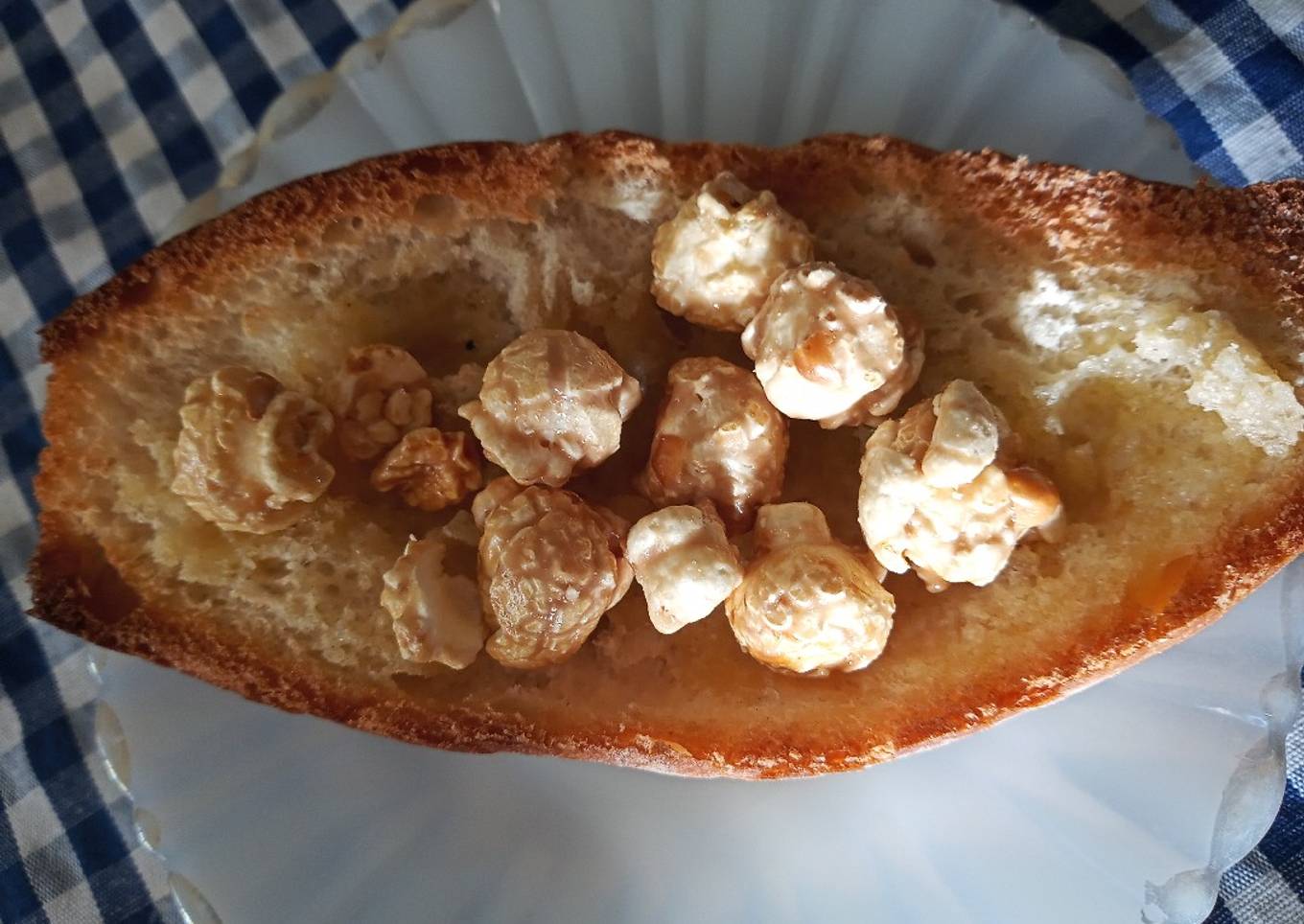 - Corta el pan por la mitad, retira ka miga. Cubre con la mantequilla y las palomitas. Hornea pir 5 min. A 175 g.