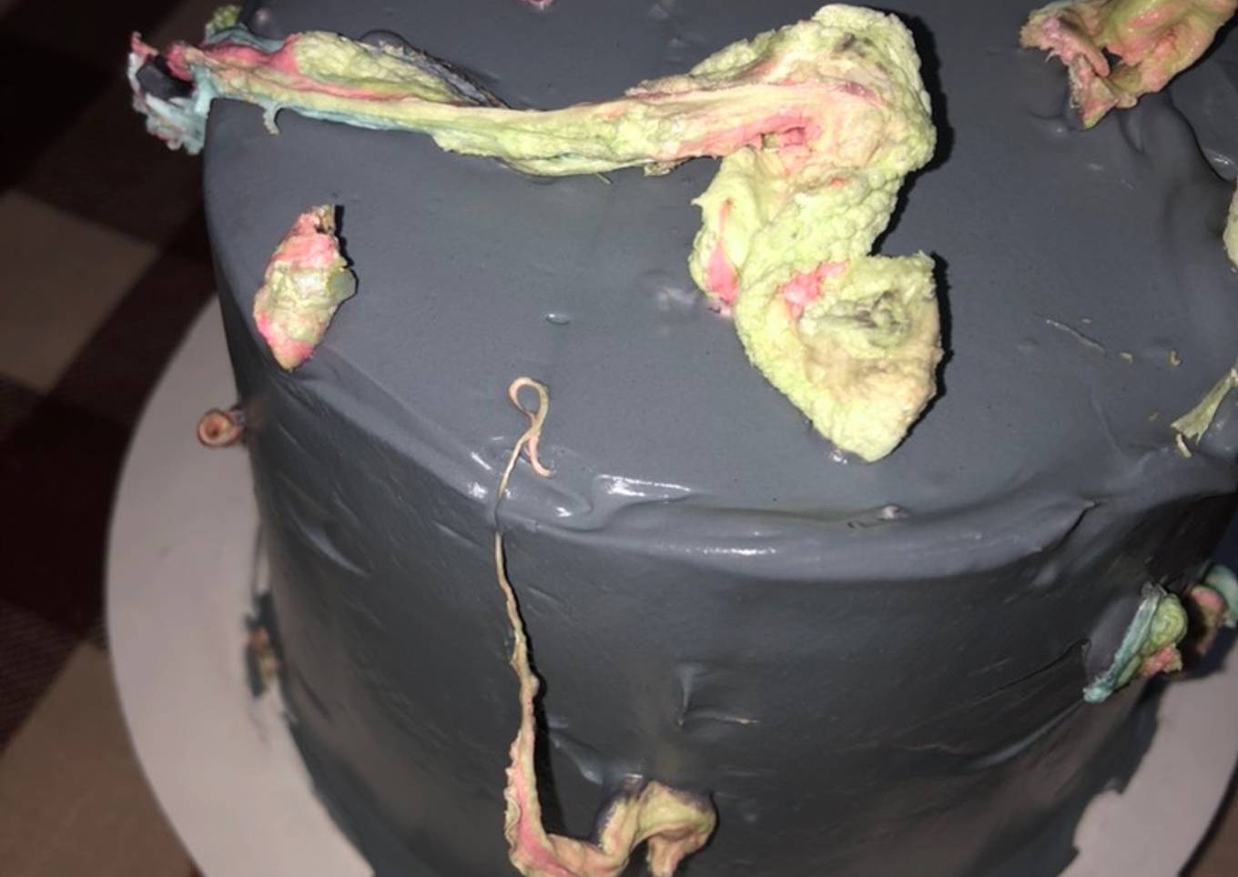 - Al final se le pone un poco de colorante en gel negro a la crema en lata y terminamos en la lisado para después, derretir los bombones y que sean como fuente de decoración para el pastel.
