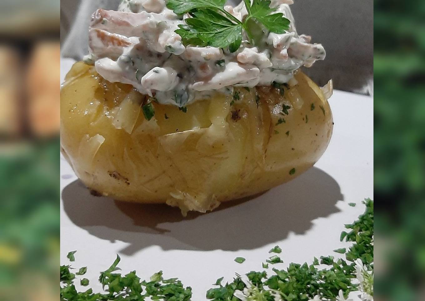 - Mezcla la crema, el tocino y el perejil y servir encima de la papa