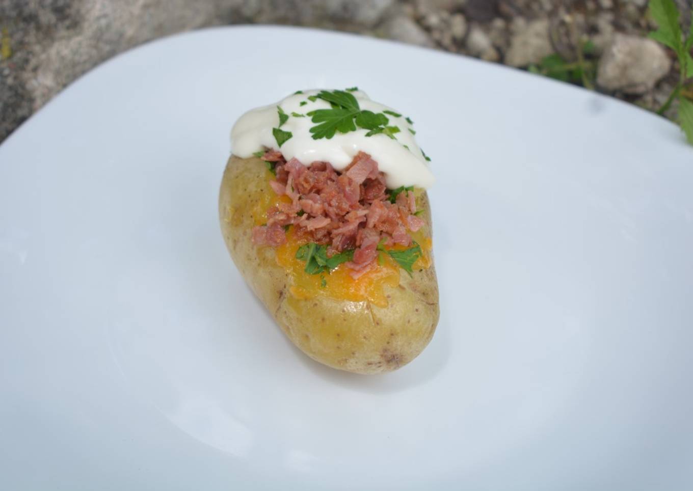 - Sacar la papa del horno, retirar un poco de pulpa. agregar queso, perejil y tocino y a disfrutar