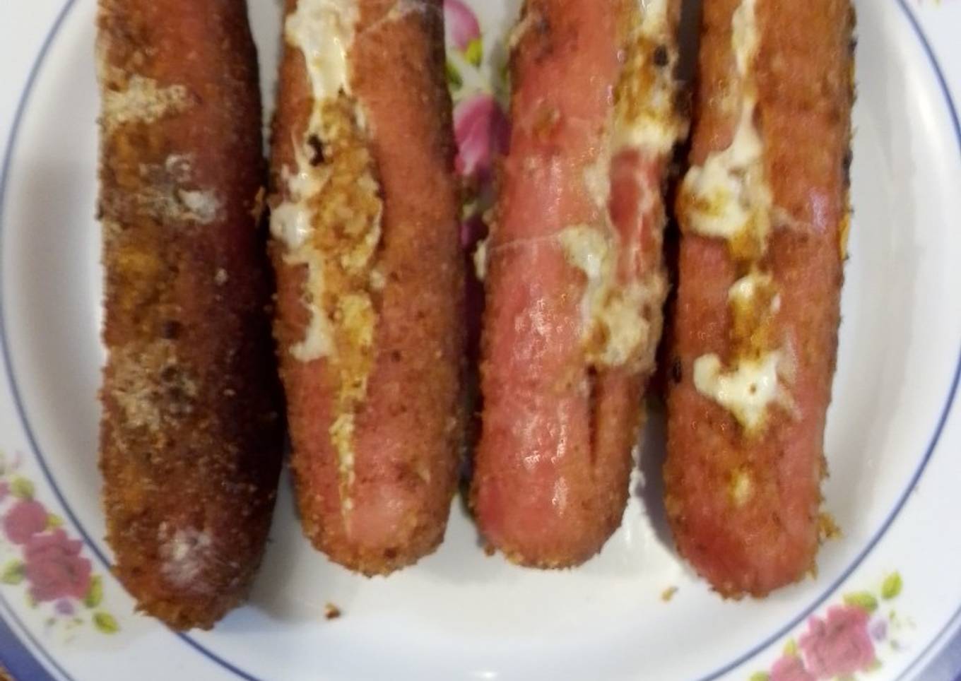 - Se pasan las salchichas ya rellenas por el huevo y luego por el pan