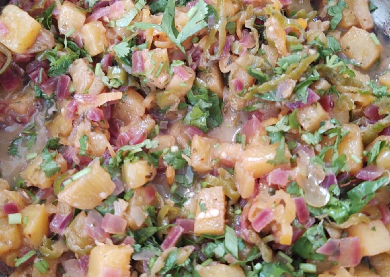 - Se fríe unos 3 minutos, cuando la piña se ha suavizado se agrega el chile habanero